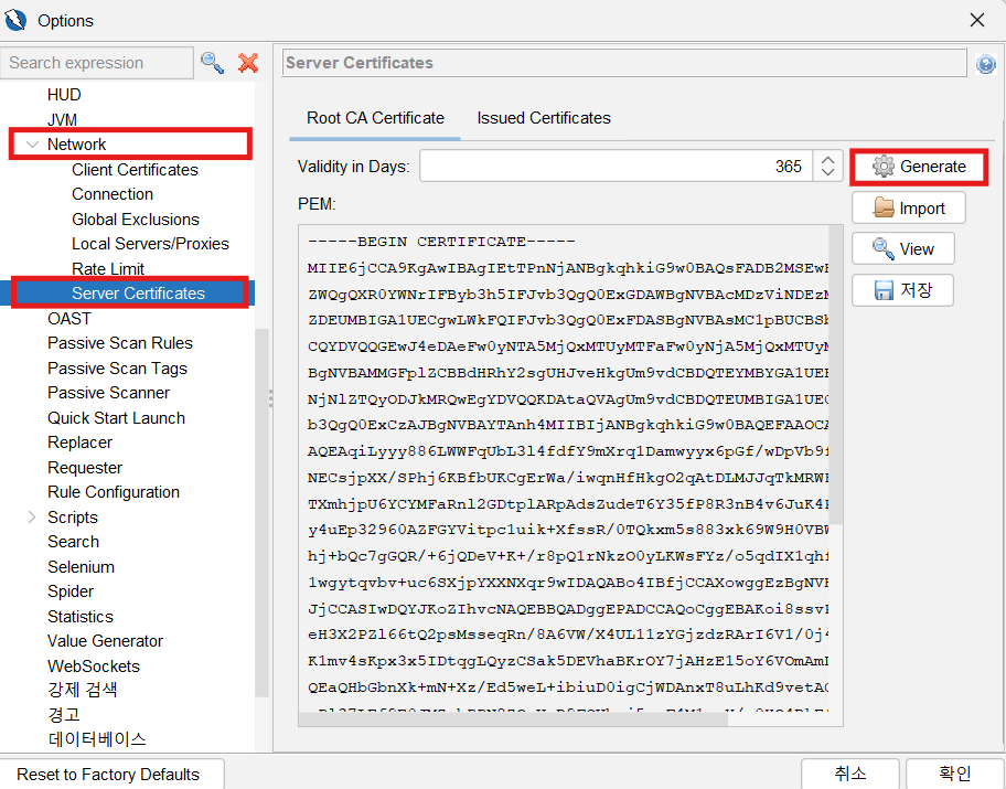 ZAP 접속 > Tools > Options > Network(Server Cerficitaes) > Generate