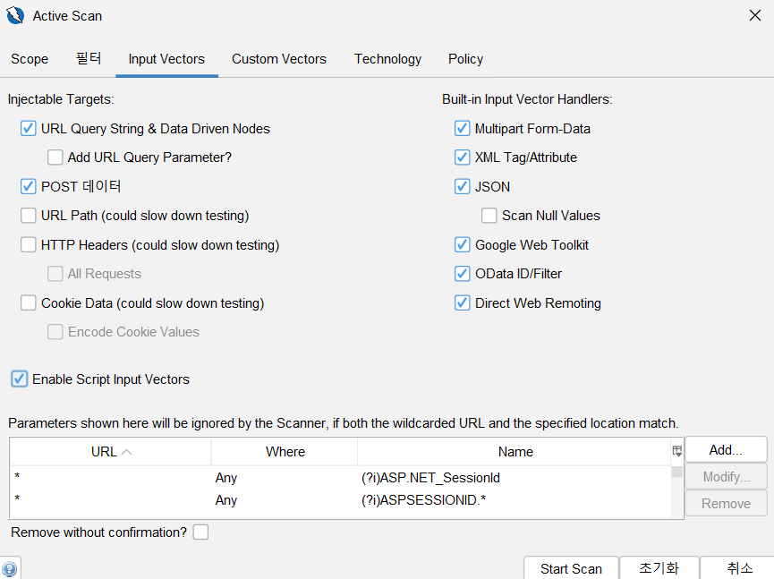 Input Vectors 탭 > 취약점 점검 요소 선택