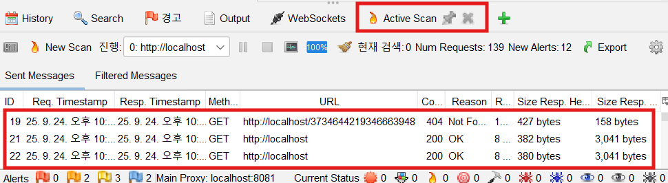 하단의 Sent Messages를 보면 Active Scan 진행률이 보입니다.