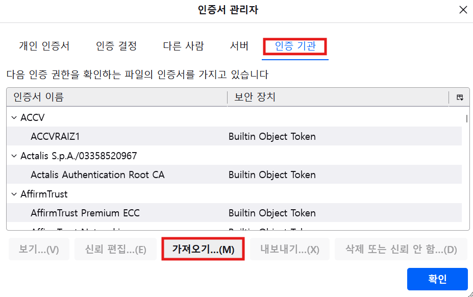 인증 기관 탭 > 가져오기 > 2.2에서 저장한 인증서 파일을 선택 > 신뢰된 인증 기관 (웹 사이트, 메일) 박스 체크 > 확인