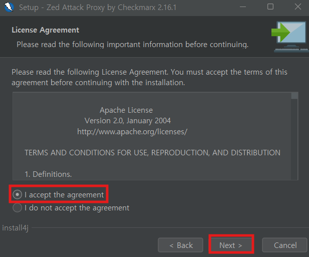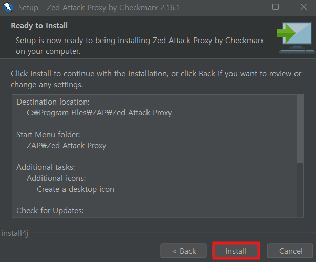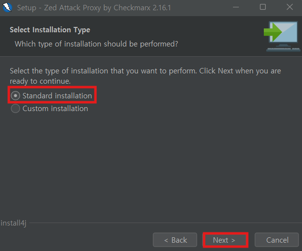 OWASP ZAP 설치 파일 실행 > Next > I agree 체크박스 선택 > Standard installation > Install