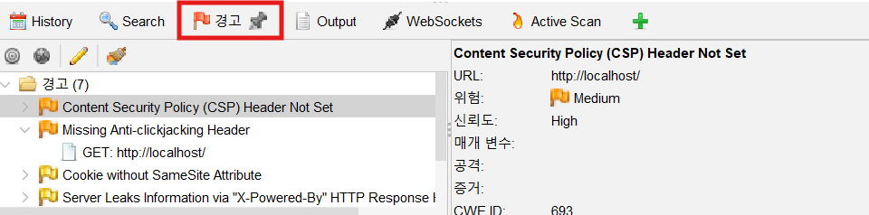 경고 탭에 접속하면 검출된 취약점과 상세 내용을 확인할 수 있습니다.