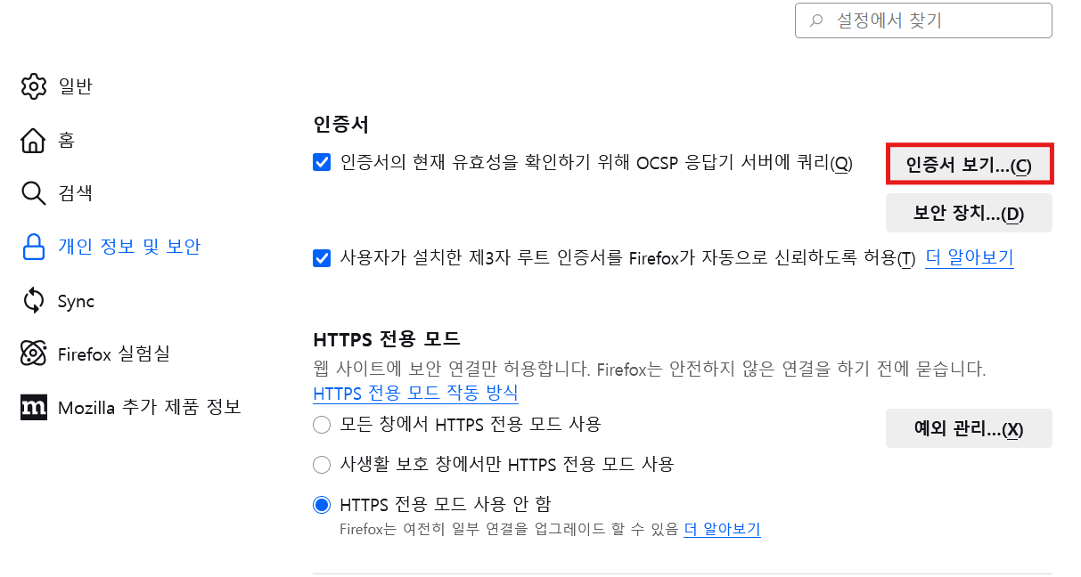 2.3 Firefox 설정에서 인증서 가져오기
