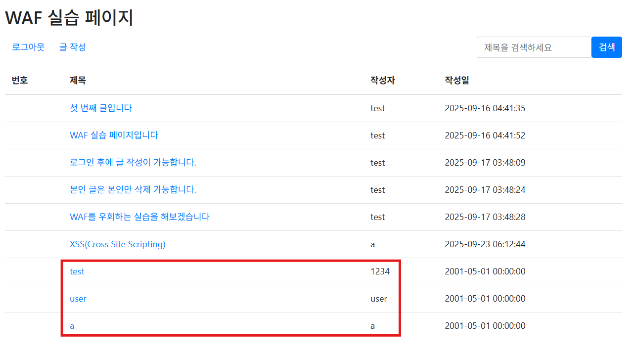 이번에도 역시 WAF 적용 전에는 SQLi 공격이 잘 처리되어 DB 데이터가 탈취된 모습을 확인할 수 있습니다.
