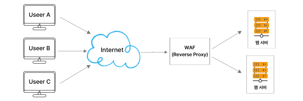 WAF는 주로 Reverse Proxy 형태로 배치되며(배치 방식은 5에서 설명), 클라이언트 → WAF → 웹 서버 순서로 트래픽이 흐릅니다.